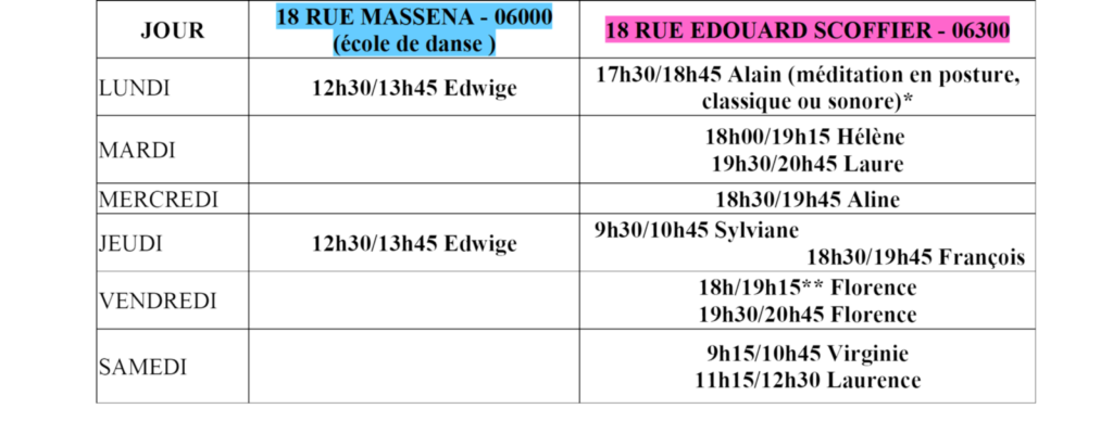 *Le cours du lundi à 17h30 est orienté vers la méditation (en posture, classique ou par les sons) pour rechercher le calme mental.